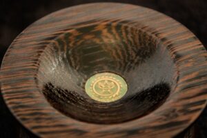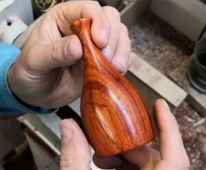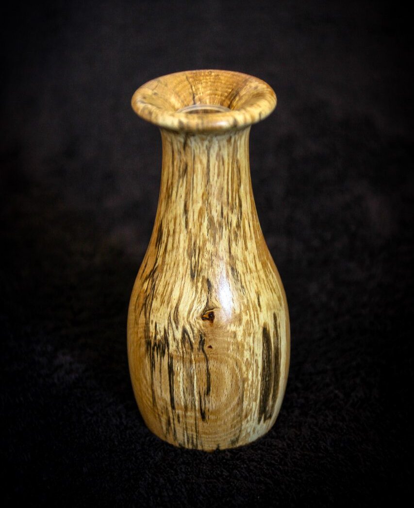 Links im Bild ist eine kleine Vase aus heimischer Buche zu sehen. Das Stück Holz dazu stammt aus einem Brennholz-Stapel, der durch Witterungseinflüsse gestockt (von Pilzen befallen) war.