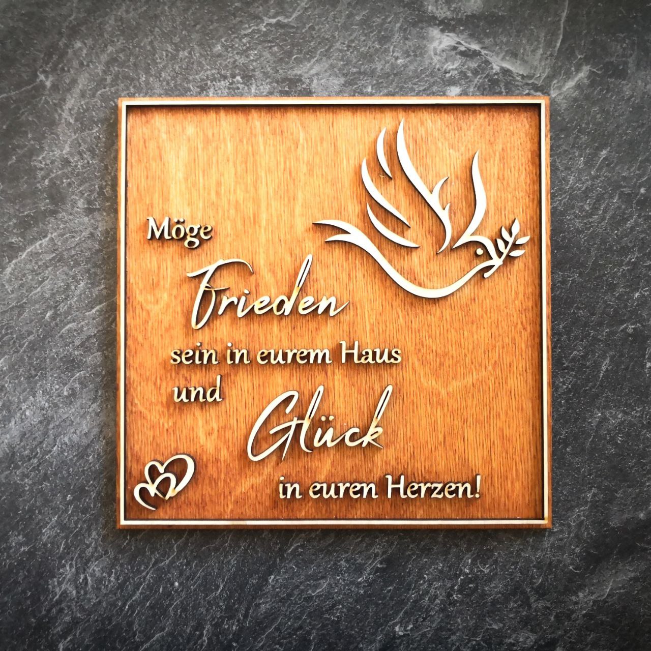 Der Haussegen misst 17 x 17 cm und ist aus zwei Lagen Birkensperrholz geschnitten. Die untere Lage wurde mit einer Lasur im Farbton Mahagoni eingefärbt und bietet somit einen schönen Kontrast zur naturbelassenen, hellen Inschrift.